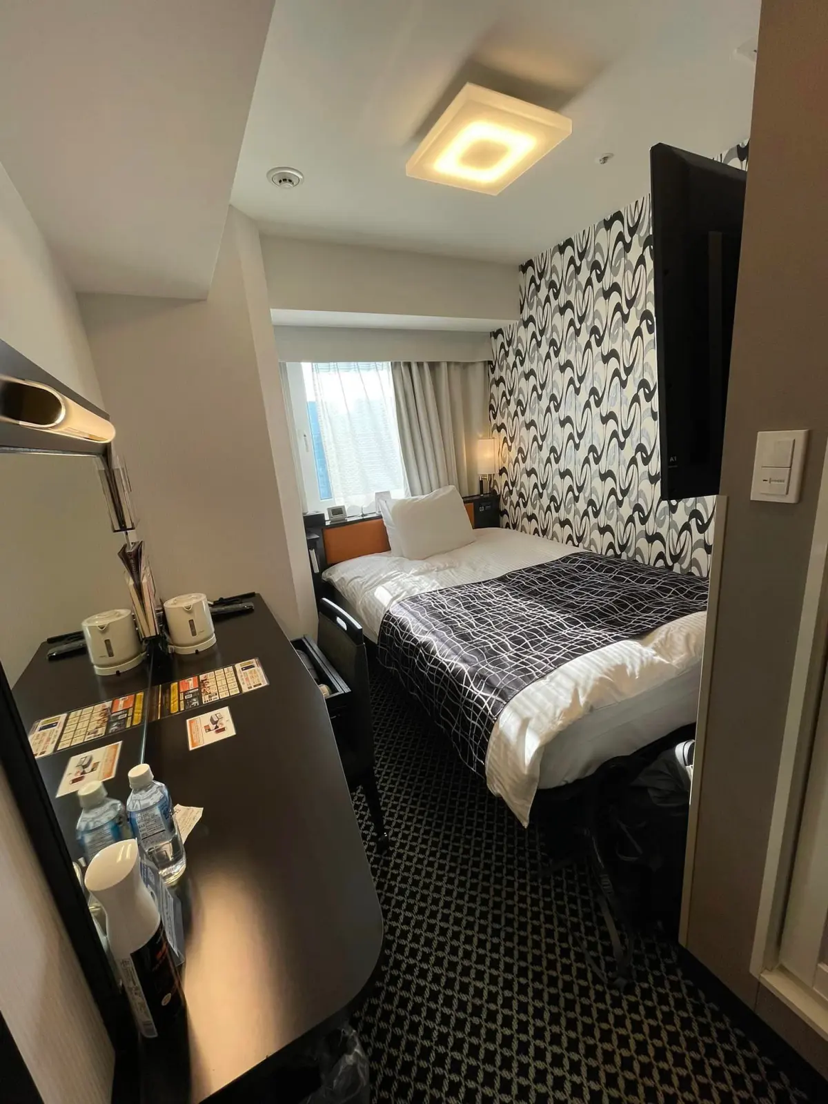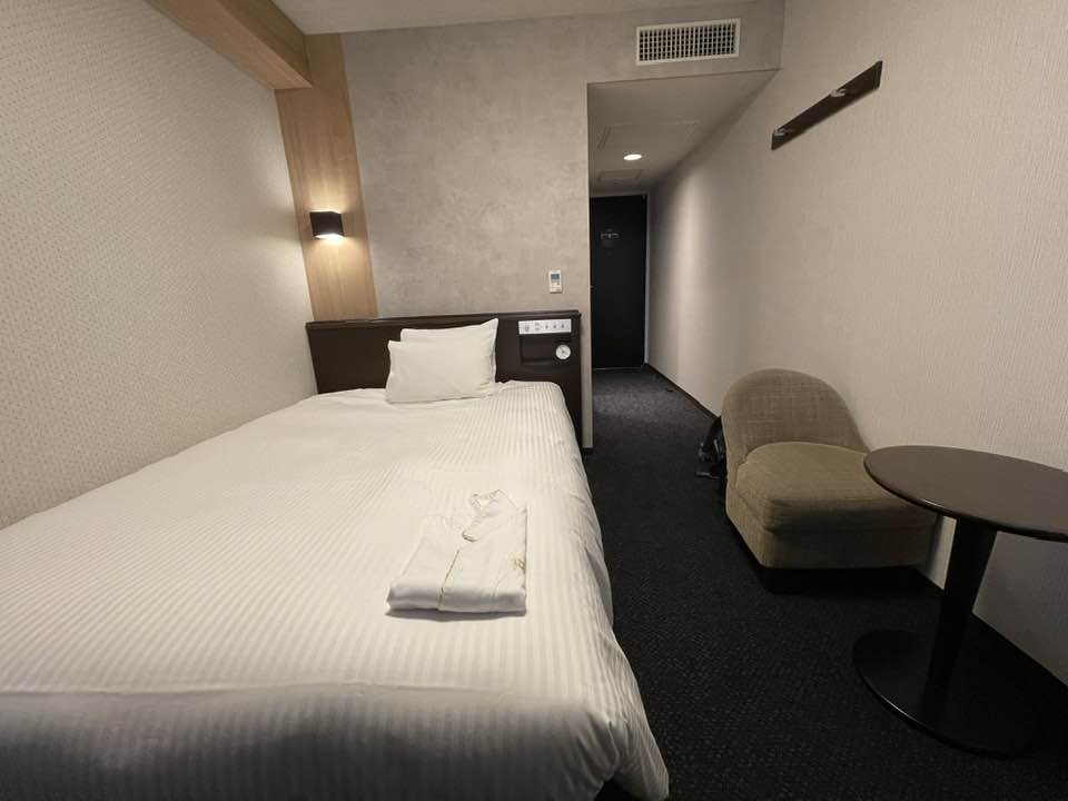 硬體也很新,不過 APA 房間都小小的,走道勉強可開行李箱,單人房的床也是可以睡2人,床底下可以放行李,浴室小但不會覺得很難活動,房間電視一通電就會開,上面顯示很多資訊,包括Wi-Fi密碼,Wi- Fi很快(最大的優點)。