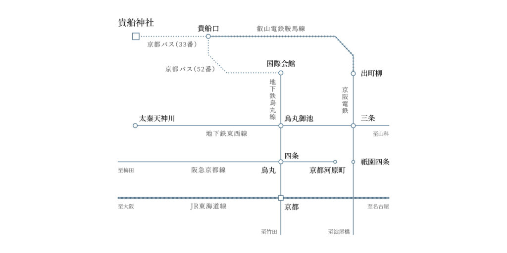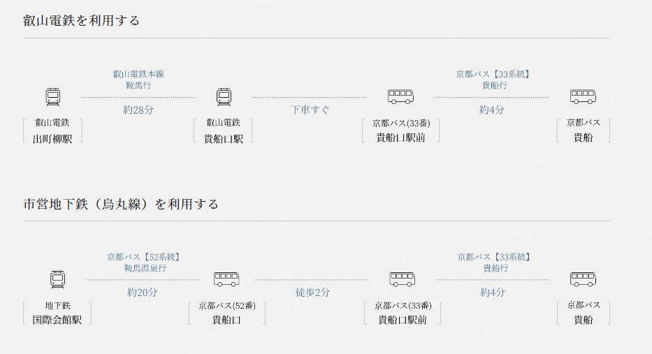參考下圖,主要有兩種方式,我自己是選擇搭乘叡山電鐵到貴船口再轉搭33號公車。