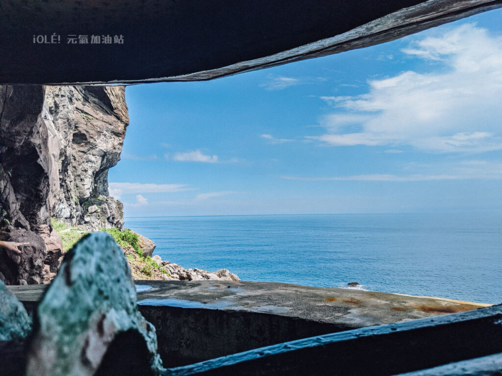 畫面上可以看到兩個半圓形的海蝕洞,從海上眺望形似眼鏡洞聞名。